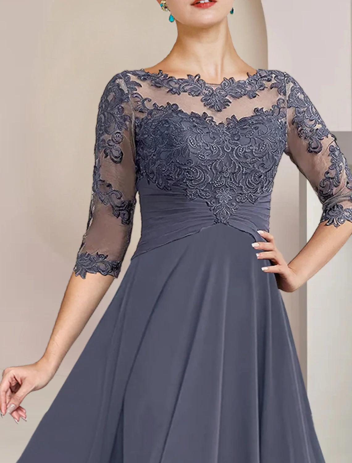 Vestido de dos piezas de corte A para madre de la novia, para invitada de boda formal, elegante, escote redondo, largo hasta la rodilla, de gasa con encaje, mangas 3/4, cruzado incluido, con apliques fruncidos