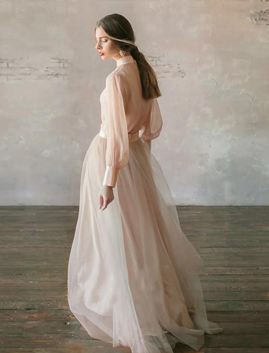 Vestido de dos piezas estilo imperio minimalista para invitadas de boda, formal, de noche, de cumpleaños, cuello alto, manga larga, largo hasta el suelo, de gasa con capa