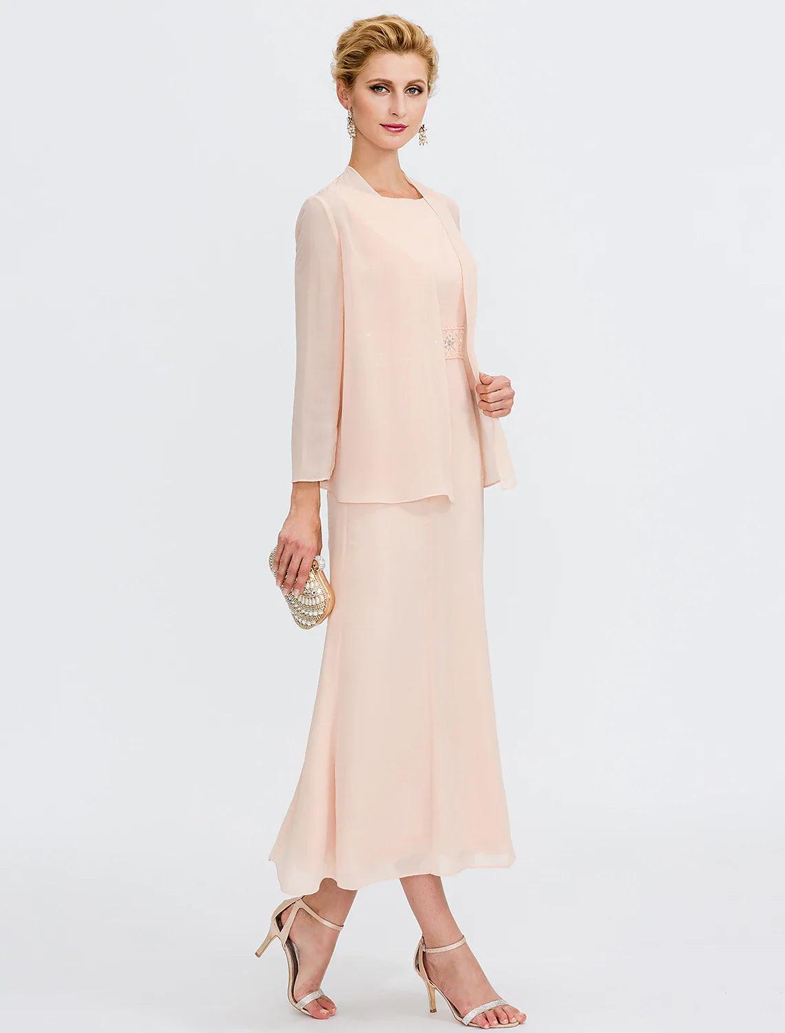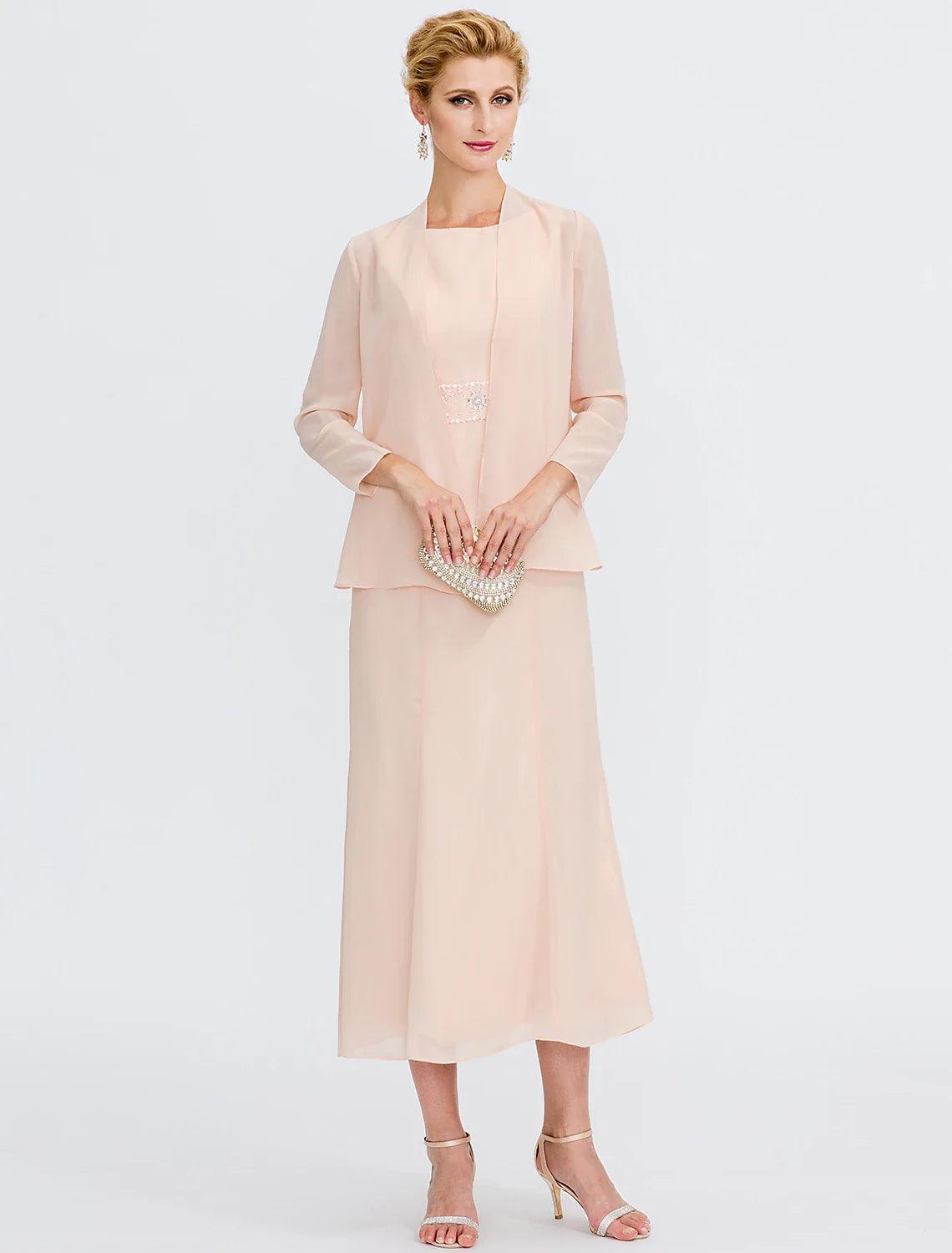 Vestido de dos piezas para madre de la novia, estilo tubo/columna, para invitada de boda, talla grande, elegante, con chaqueta, manga larga, escote redondo, largo hasta la rodilla, gasa, faja/cinta, pliegues y abalorios
