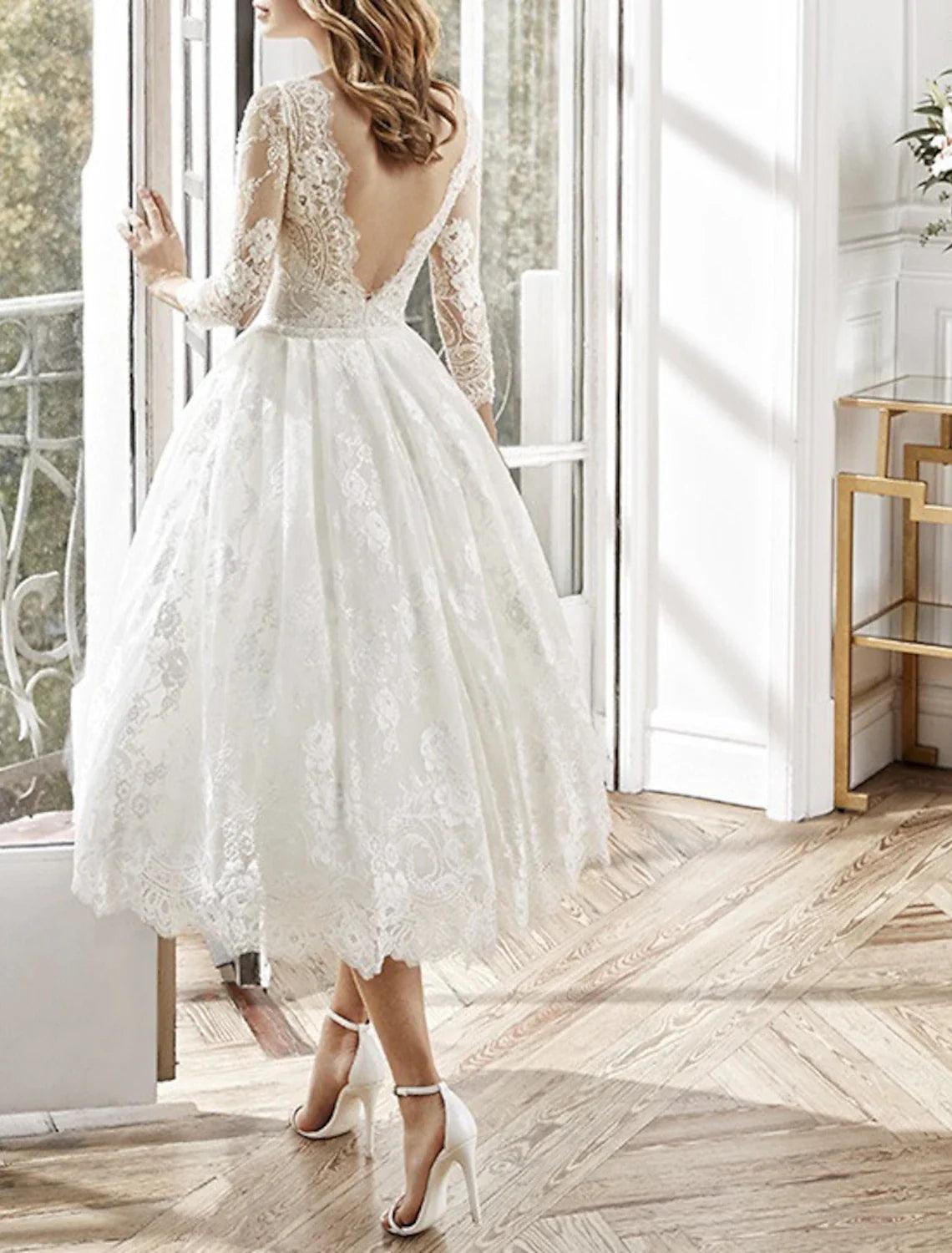 Vestidos de novia vintage de los años 40/50, corte A, escote redondo, manga larga, largo hasta la rodilla, de encaje y apliques.