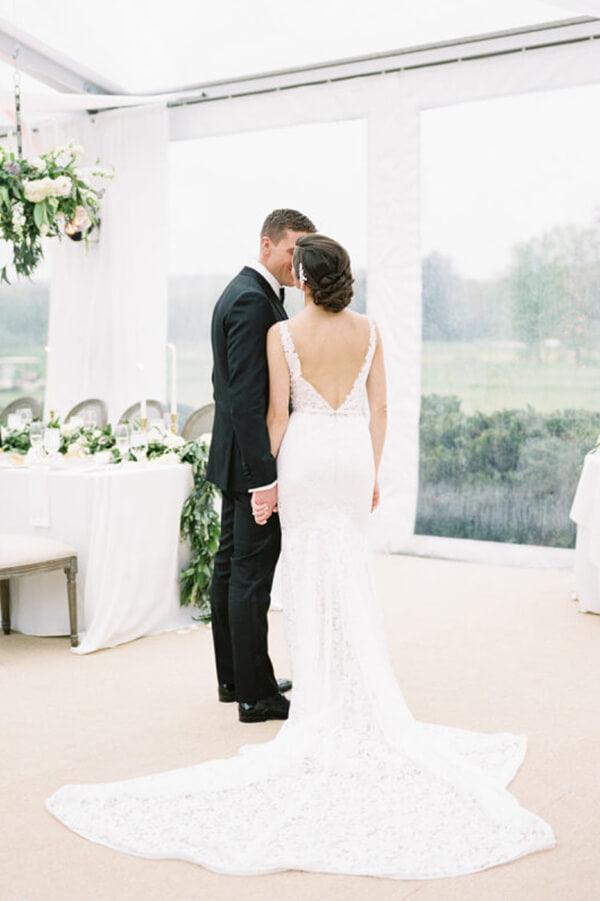 Vestido de novia vintage de encaje color marfil con escote en V y corte sirena. Vestidos de novia. MW533