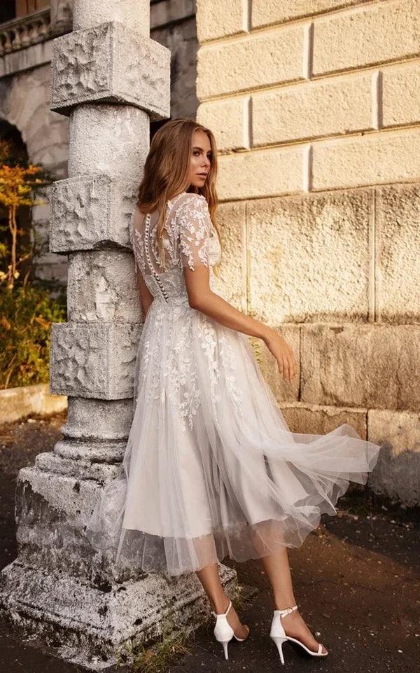 Vestido de novia largo hasta la rodilla, etéreo, moderno, corte A, escote en V, espalda con botones