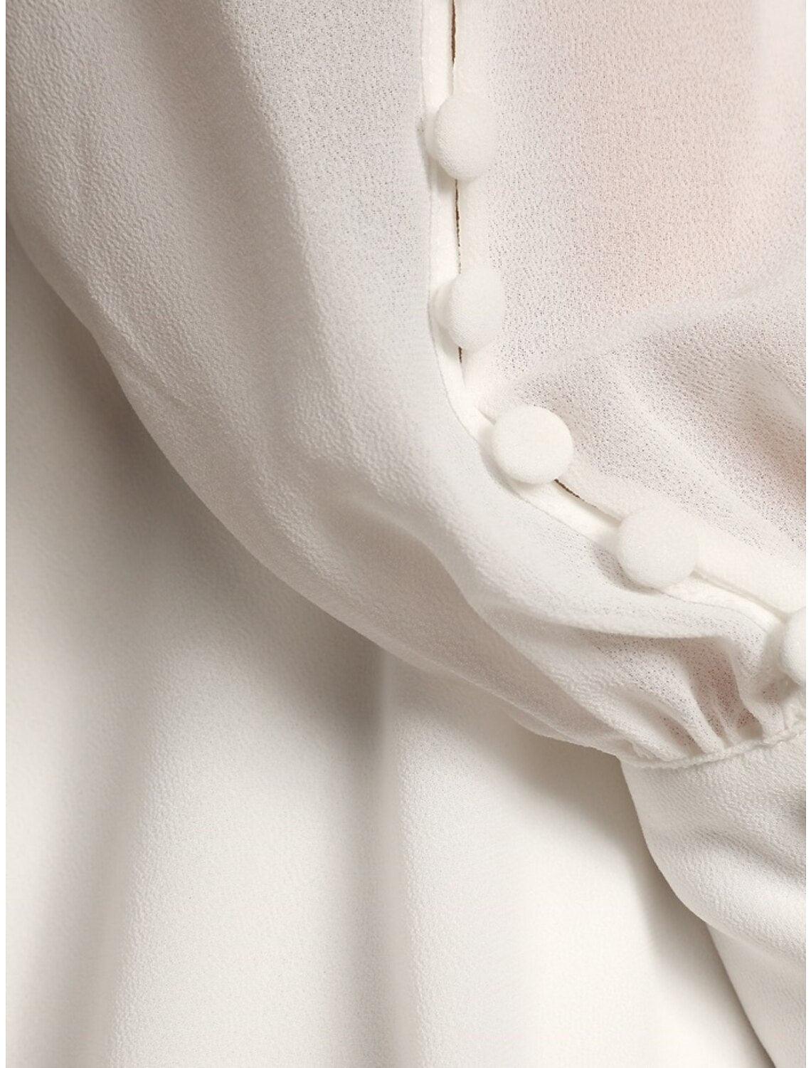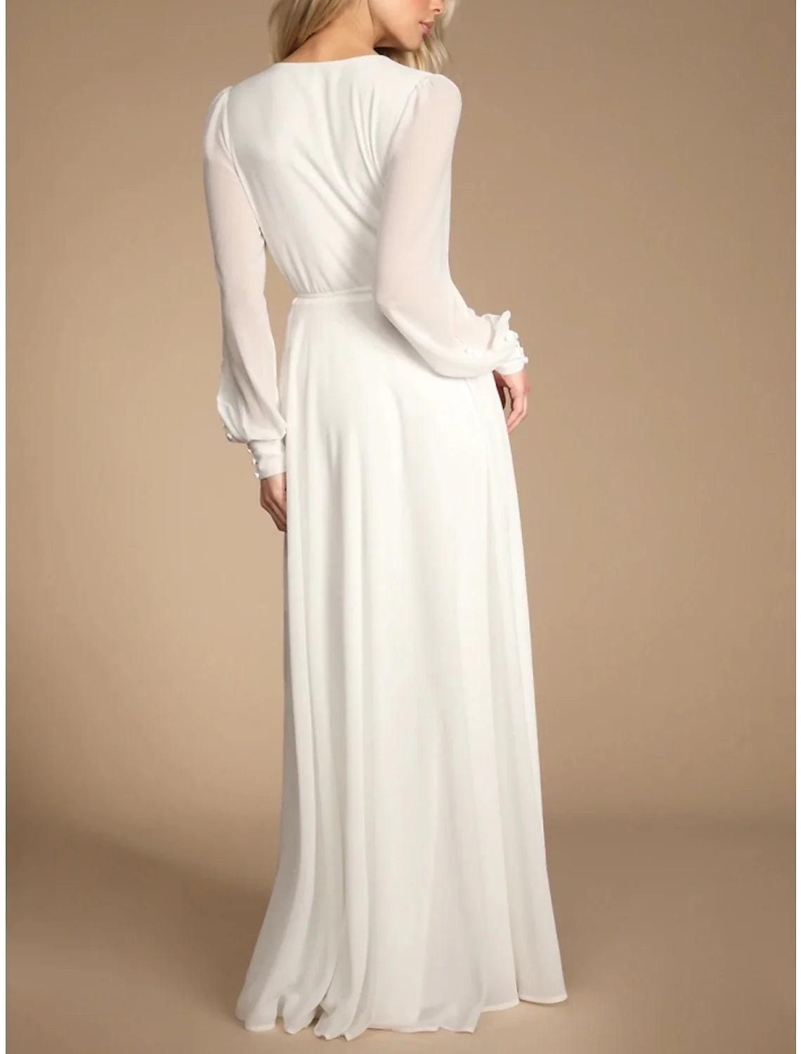 Vestidos de novia de gasa con escote en V, manga larga, largo hasta el suelo y pliegues en la parte delantera.
