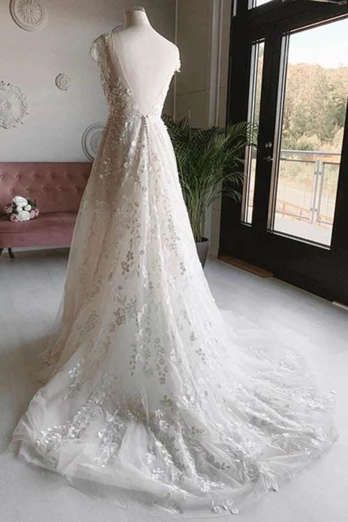 Vestido de novia largo de tul blanco con escote en V, sin mangas, espalda abierta y encaje floral. MW462
