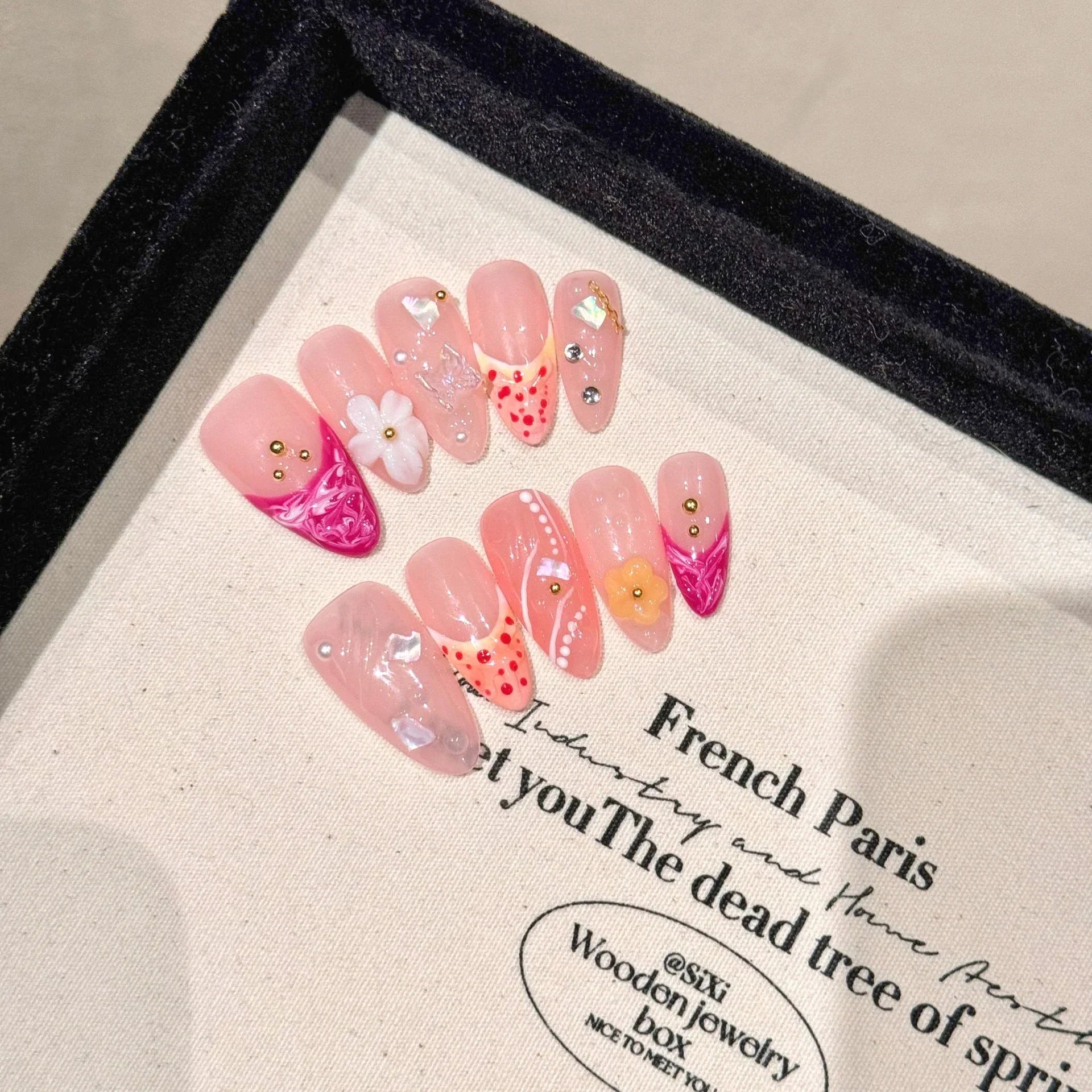 Vibrant Floral Patterns: These short almond-shaped false nails feature a variety of colorful and eye-catching floral patterns. adding a touch of elegance and charm to your manicure.