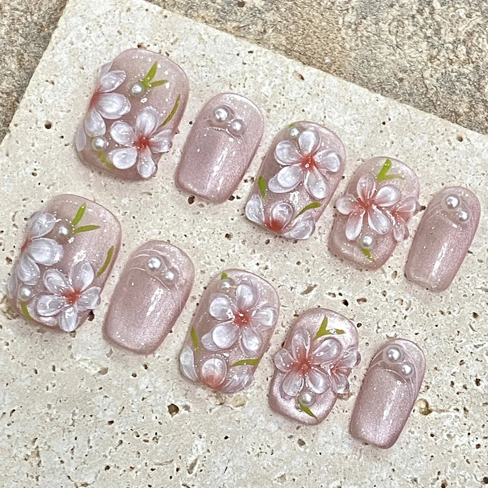 Easy Application: These nude press-on nails with floral designs are easy to apply and remove. making them a convenient and reusable option for professional nail art or personal use.