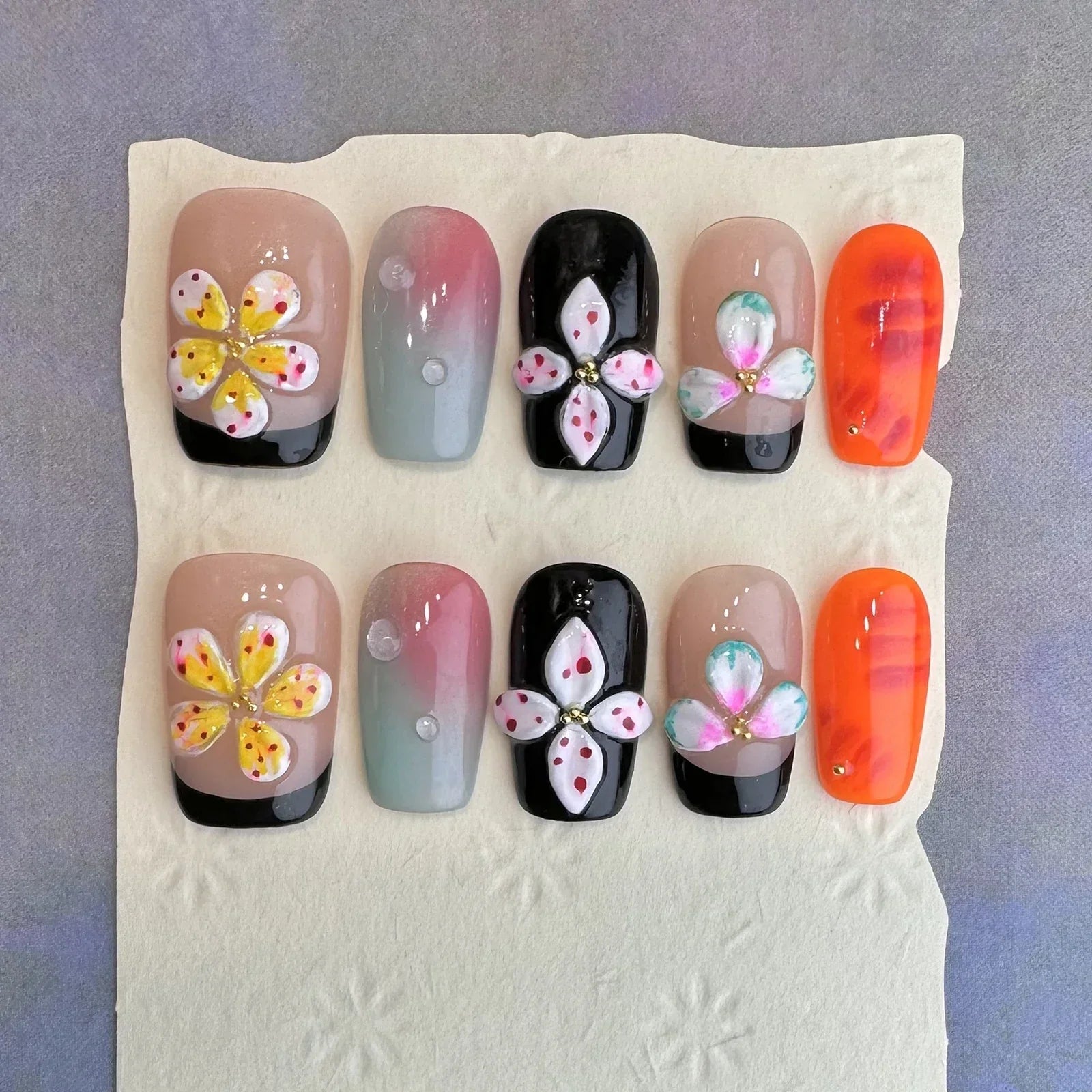 3D Floral Design: Elevate your nail game with false nails featuring intricate three-dimensional flowers for a stunning and unique look that stands out.