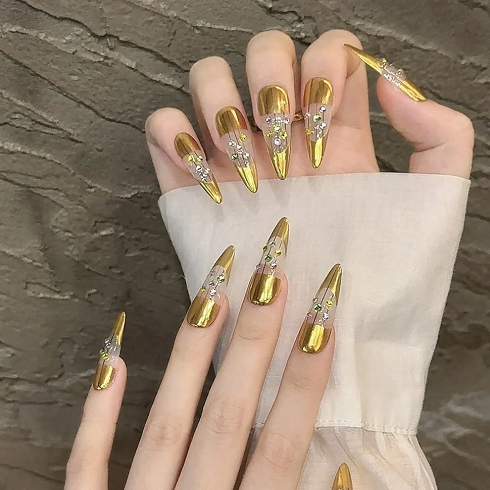 Stunning Gold Rhinestone Design: Elevate your nail game with these luxurious gold press-on nails adorned with shimmering rhinestones. perfect for adding glamour to any look.