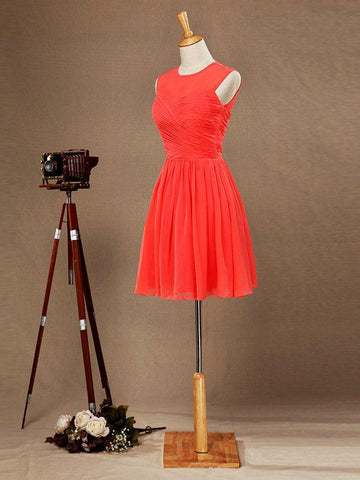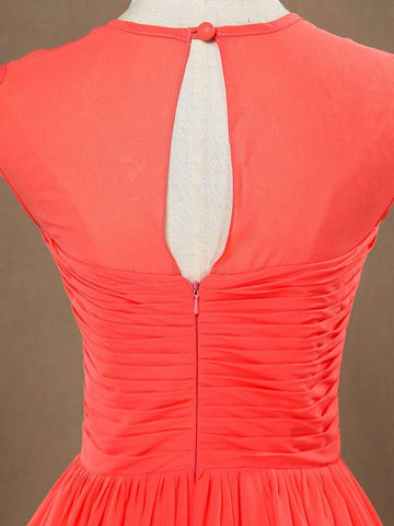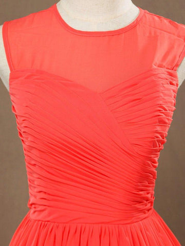 1.A-Line Coral Jewel Neck Knee Length Chiffon Bridesmaid Dress with Criss Cross Ruching Pleats Made-to-order.