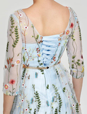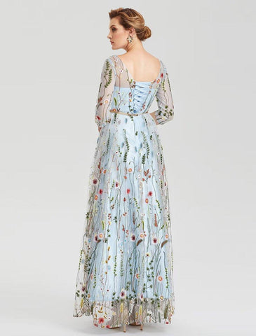 A-Line Empire Dress Party Wear Floor Length 3/4 Length Sleeve Illusion Neck Lace with Embroidery Appliques