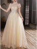 A-Line Evening Gown Sparkle & Shine Dress Engagement Prom Floor Length Short Sleeve Stand Collar Satin with Buttons Ruched Pearls