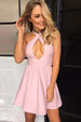 Look stunningly beautiful in this charming A-Line Halter Short Keyhole Sleeveless Pink Satin Homecoming Dress. Perfect for any special occasion. this dress features an elegant pink satin fabric and a flattering A-line shape. The halter neckline. keyhole cutouts. and sleeveless design make it a timeless classic sure to turn heads.
