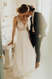 Cheap Tulle A-line V-neck Backless Sweep Train Wedding Dress with Pearls.MW429