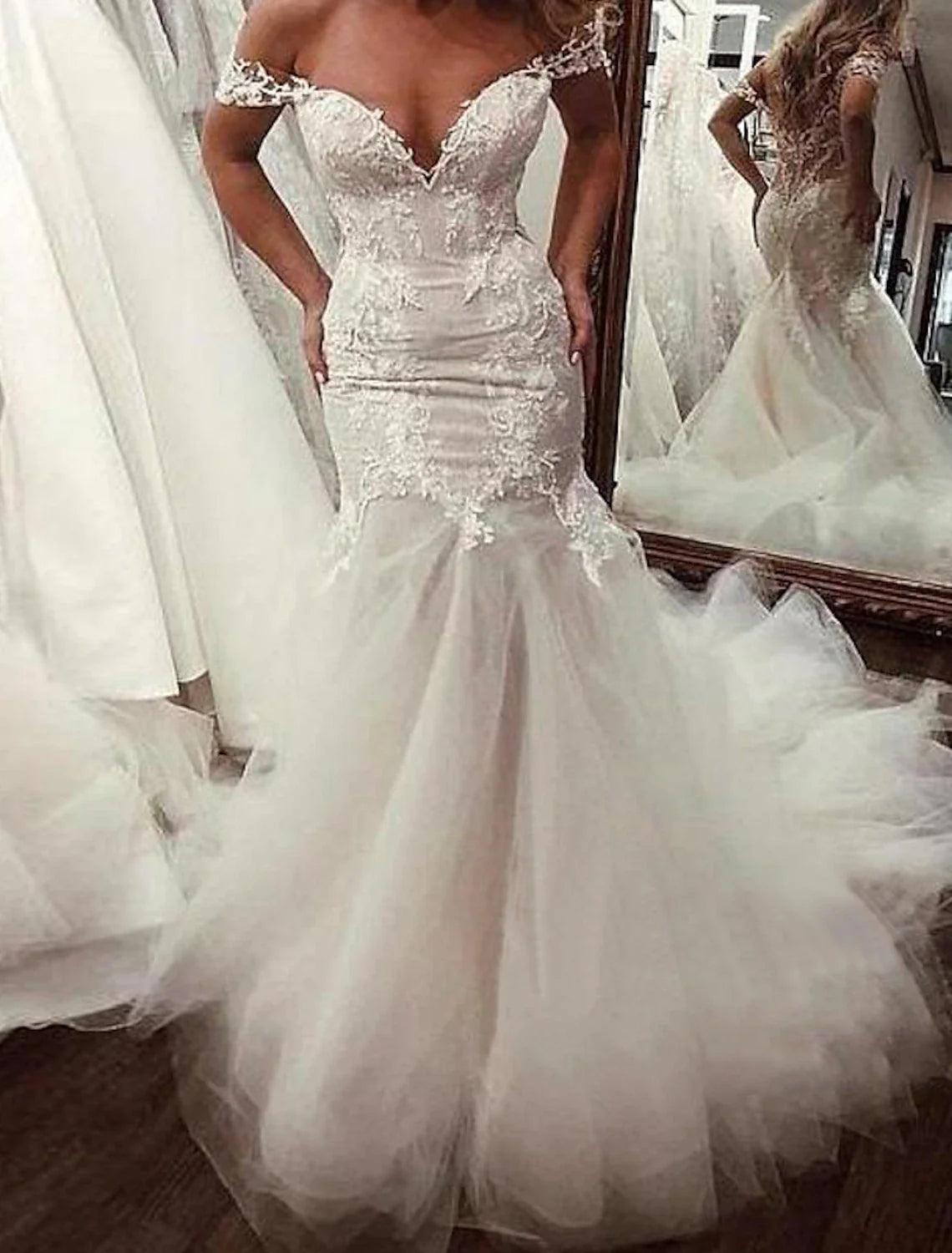 Engagement Open Back Wedding Dresses Mermaid / Trumpet Off Shoulder Cap Sleeve Chapel Train Satin Bridal Gowns With Appliques Solid Color Summer Fall Wedding Party