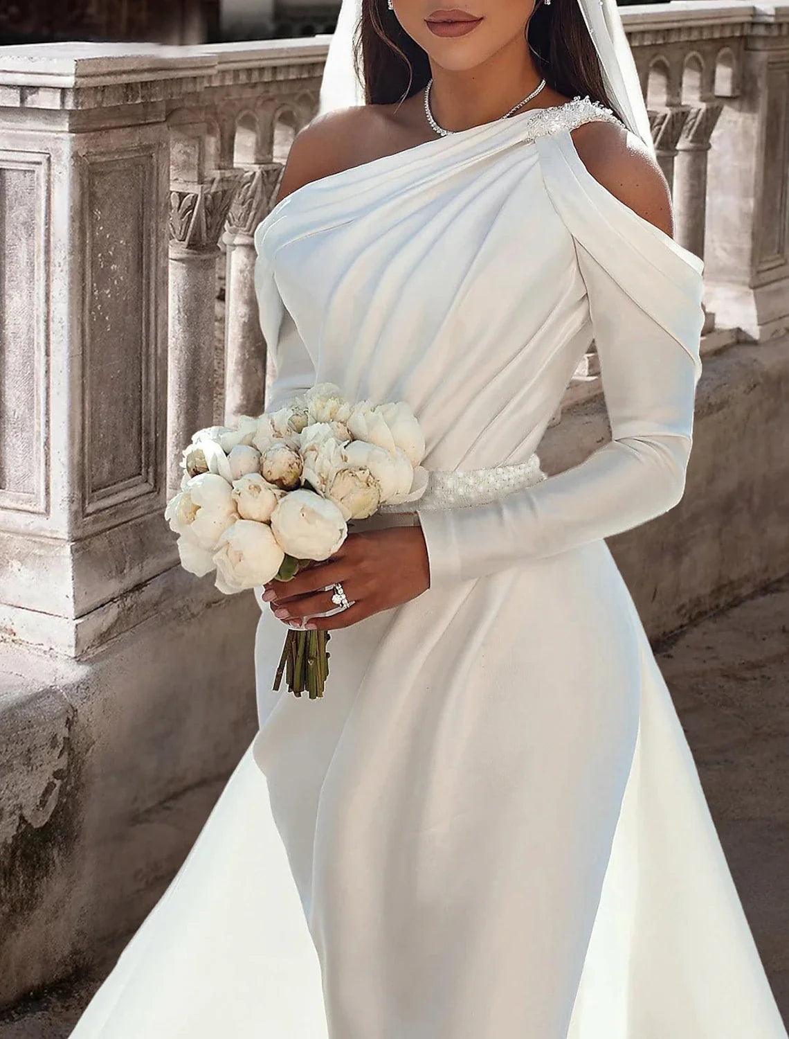 Formal Wedding Dresses Two Piece One Shoulder Long Sleeve Floor Length Satin Bridal Gowns With Sash / Ribbon Beading