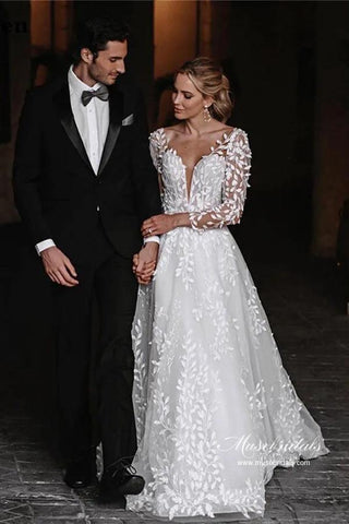 Leaves Lace Tulle Long Sleeves Boho Wedding Dresses. Bridal Gown. MW962