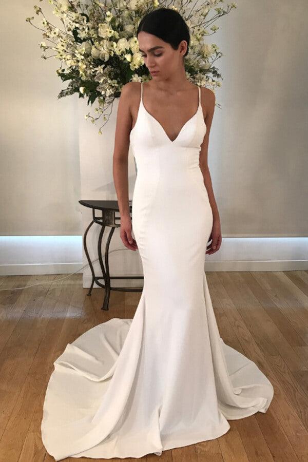 Satin Mermaid Spaghetti Straps V-neck Wedding Dresses with Train. MW670