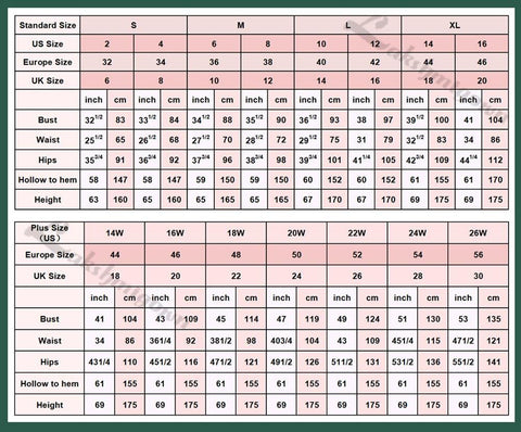 | US SIZE | BUST(inch/cm) | WAIST(inch/cm) | HIP(inch/cm) | HOLLOW TO HEM(inch/cm)) |
