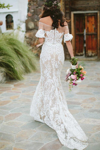 Sheath Off the Shoulder White Lace Long Wedding Dresses.Half Sleeves Wedding Dresses.MW480