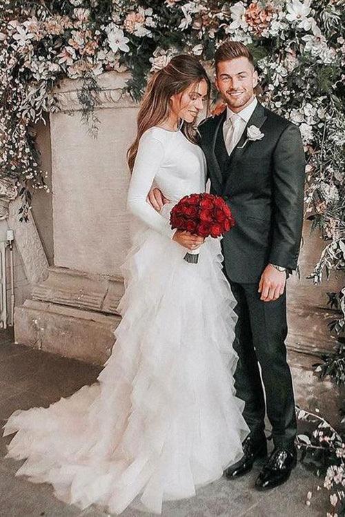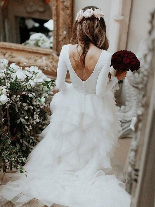 Simple Long Sleeve Ivory White Wedding Dresses with Ruffle Skirt.MW497