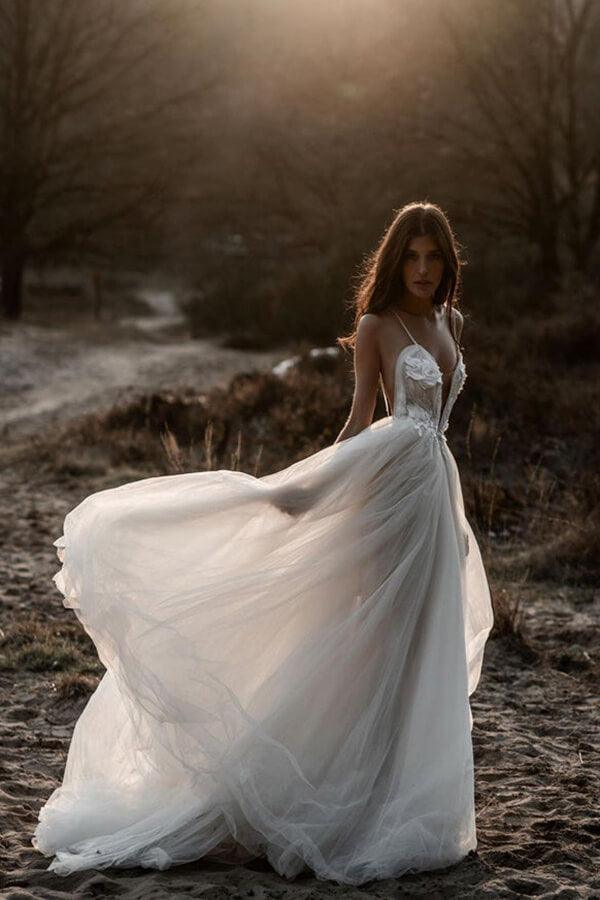 Tulle A-line Deep V-neck Backless Spaghetti Straps Wedding Dresses. MW678