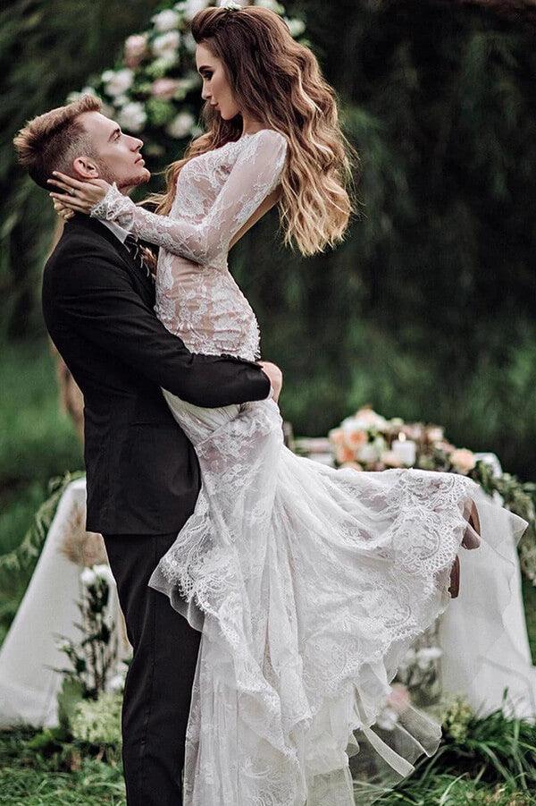 Tulle Mermaid Backless Long sleeves Lace Wedding Dresses With Train. MW1023