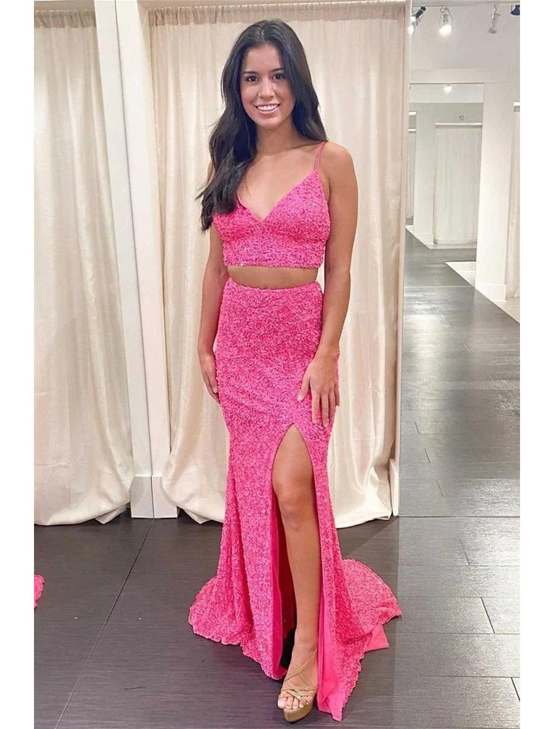 Two Piece Ball Gown Mermaid / Trumpet Prom Dresses Sparkle & Shine Dress Party Wear Prom Sweep / Brush Train Sleeveless Spaghetti Strap Sequined Backless with Sequin Slit