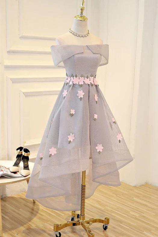 Light Grey Tulle with Flowers High Low Fashionable Party Dress. Grey Homecoming Dresses